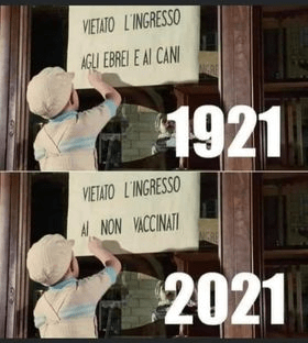 Conclusioni: Un parallelismo del nostro passato con la situazione che stiamo vivendo attualmente ci porta a riflettere sulle tante analogie con una delle pagine più buie della storia dell’uomo: il fascismo, il nazismo e gli orrori che essi produssero. Ricordiamo che all’epoca mentre milioni di persone venivano discriminate, violentate e portate nei campi di concentramento dove in seguito verranno usate come cavie per mostruosi esperimenti o barbaramente uccise nelle tristemente famose “camere a gas”, un’altra parte della popolazione restava in silenzio e continuava a vivere come se la cosa non riguardasse loro. Il silenzio delle varie Chiese che addirittura mostrarono quasi accondiscendenza con le leggi razziali, ci ricordano di un passato scomodo e che si vorrebbe dimenticare. La deriva che oggigiorno sembra aver preso il governo italiano con la scelta di istituire un lasciapassare verde e discriminare una parte di quella popolazione che per scelta o per questioni di salute non vuole o non può vaccinarsi, porta noi tutti su una china molto pericolosa.