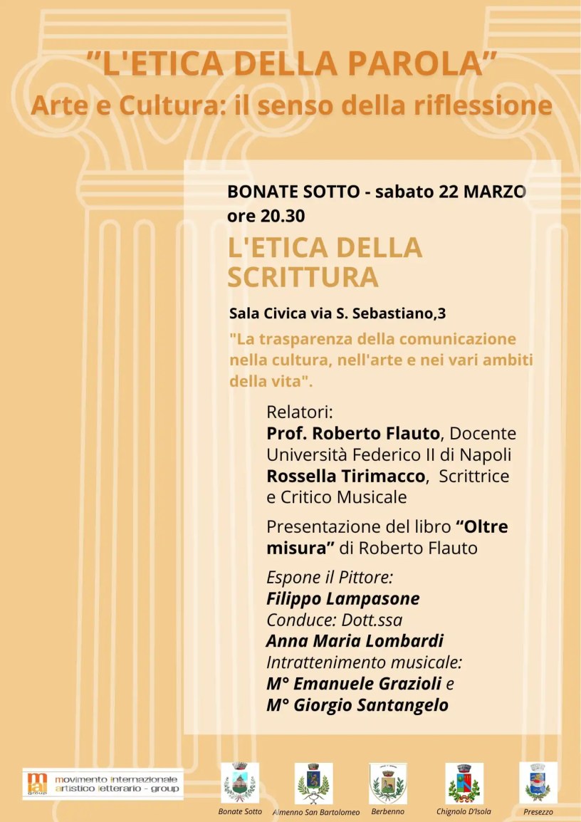 “Il 22 marzo sarò a Bonate Sotto, in provincia di Bergamo, presso la Sala Civica di San Sebastiano, come relatrice del primo incontro del ciclo di conferenze itineranti ‘L’Etica della Parola’, promosso dal Movimento Artistico Letterario Group.”